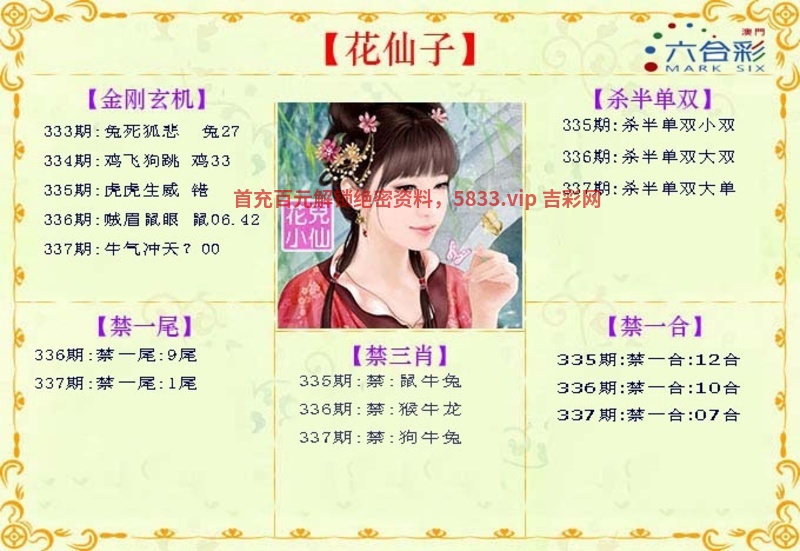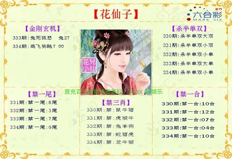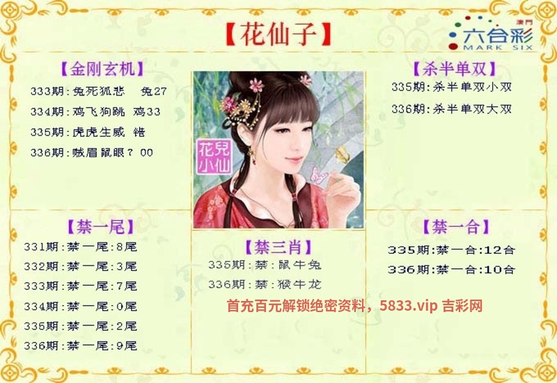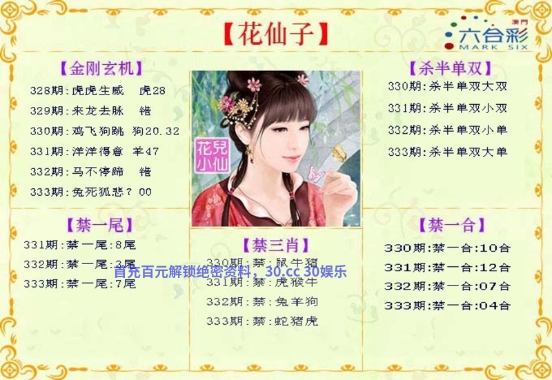 | 330期:【八仙过海】 【一声金磐千花发,当三折二小钱儿,尘事悠悠了不关,他日始信入木妙】 解:意思是金解出金肖猴鸡,二三解出二尾和三尾,木解出木肖虎兔 生肖:虎马猪鸡羊猴 |